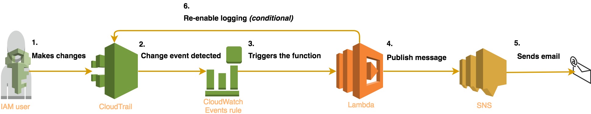 In this post, I describe a solution to notify on changes to CloudTrail and re-enable logging whenever logging is disabled.