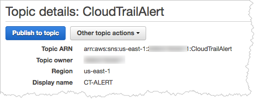 In the SNS console, choose Create topic and enter appropriate values for Topic name (such as CloudTrailAlert) and Display name (CT-Alert). Choose Create topic. Select the topic and view the details.