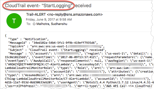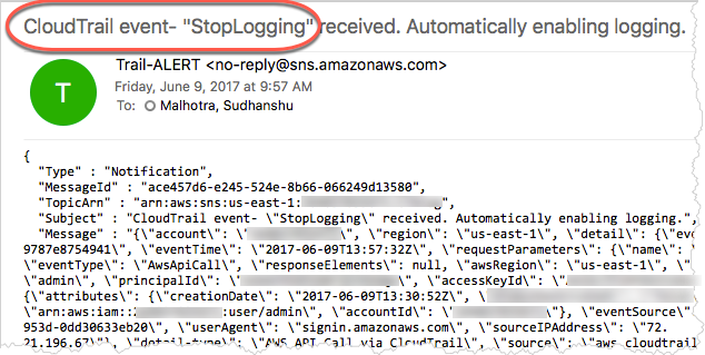 After a “StopLogging” event is detected, the Lambda function re-enables logging for that trail. This generates a “StartLogging” event that again sends an SNS notification.